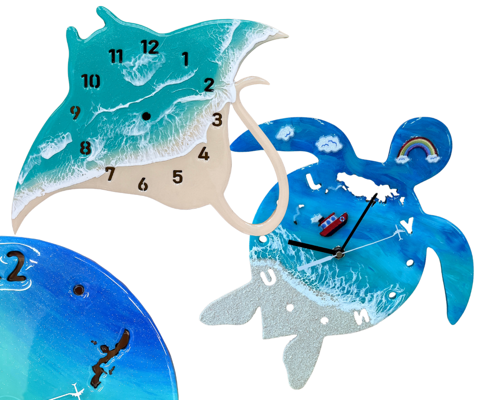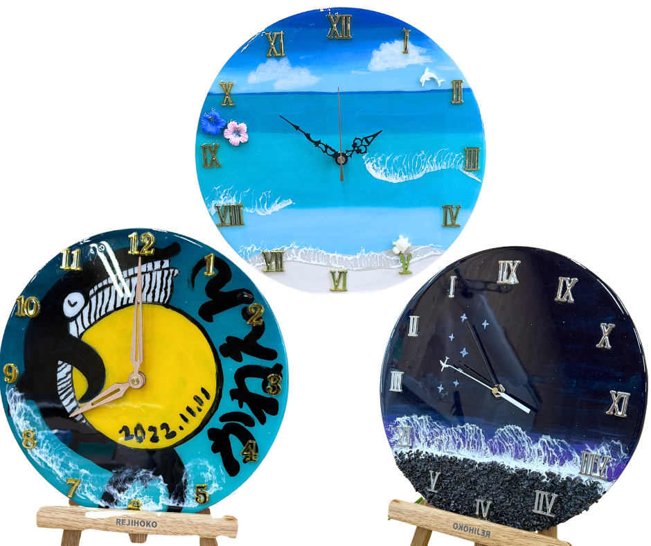 時計の形そのものからデザインできる、レジホコ最高峰の完全オーダーメイド体験。ウミガメ・マンタなど好きなシルエットをデザイナーと一緒に決め、文字の切り抜きや装飾まで自分好みにカスタマイズ。唯一無二の時計が誕生します。大切な人への特別な贈り物にも最適です♡