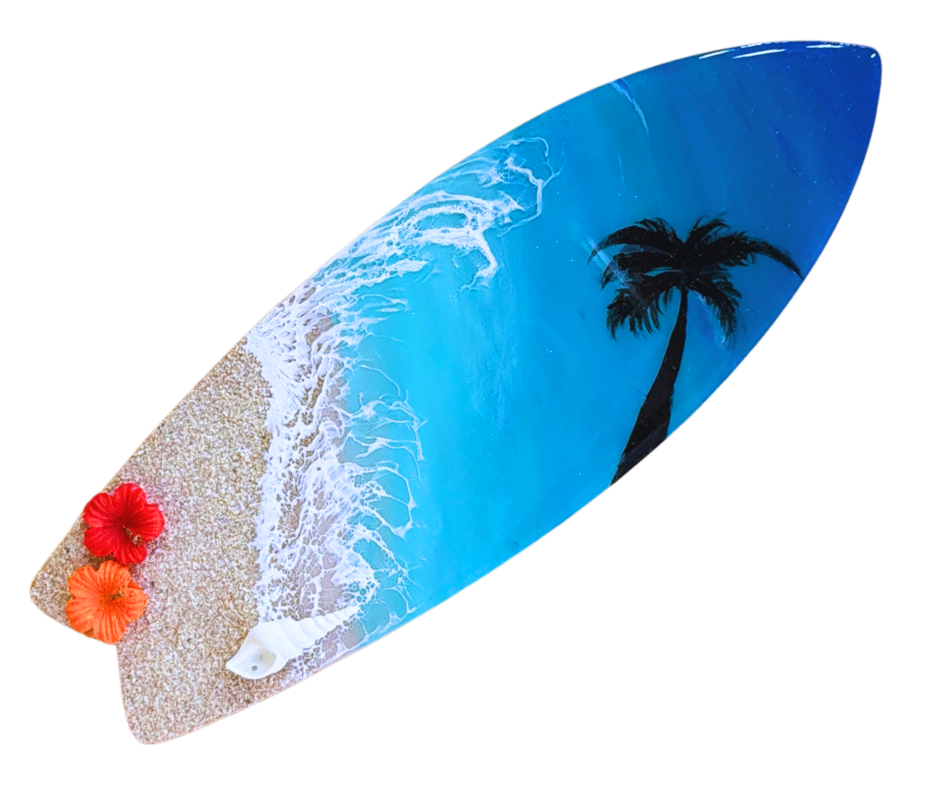 サーフボード型のキャンバスに、自分だけの海を自由に描く。サンセットのグラデーションや南国のヤシの木など、デザインは無限大。お部屋に飾れば、見るたびに海の記憶が蘇る癒しのインテリアになります。 (自立棒付き)